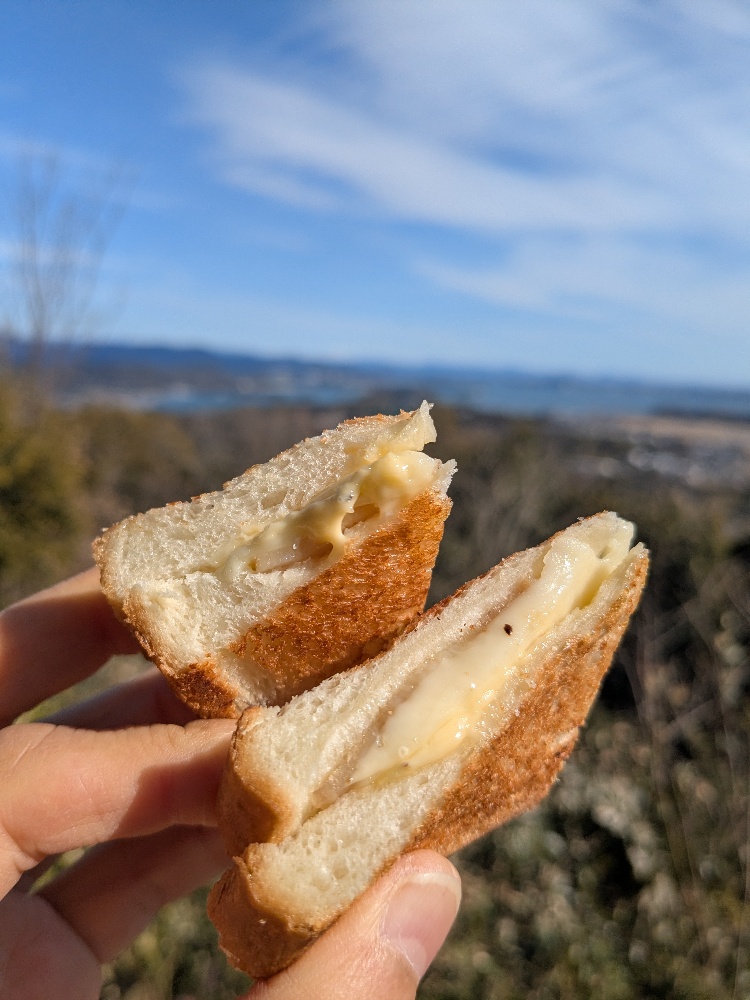 山頂では、ホットサンド、スープ、茶碗蒸し、コーヒーでランチタイム。